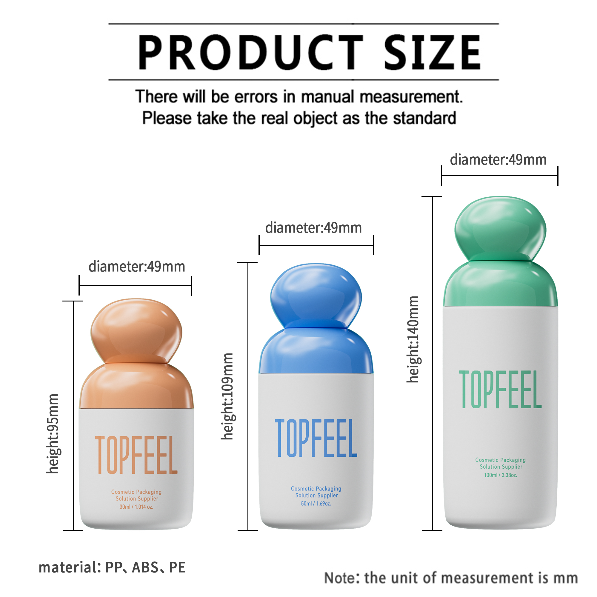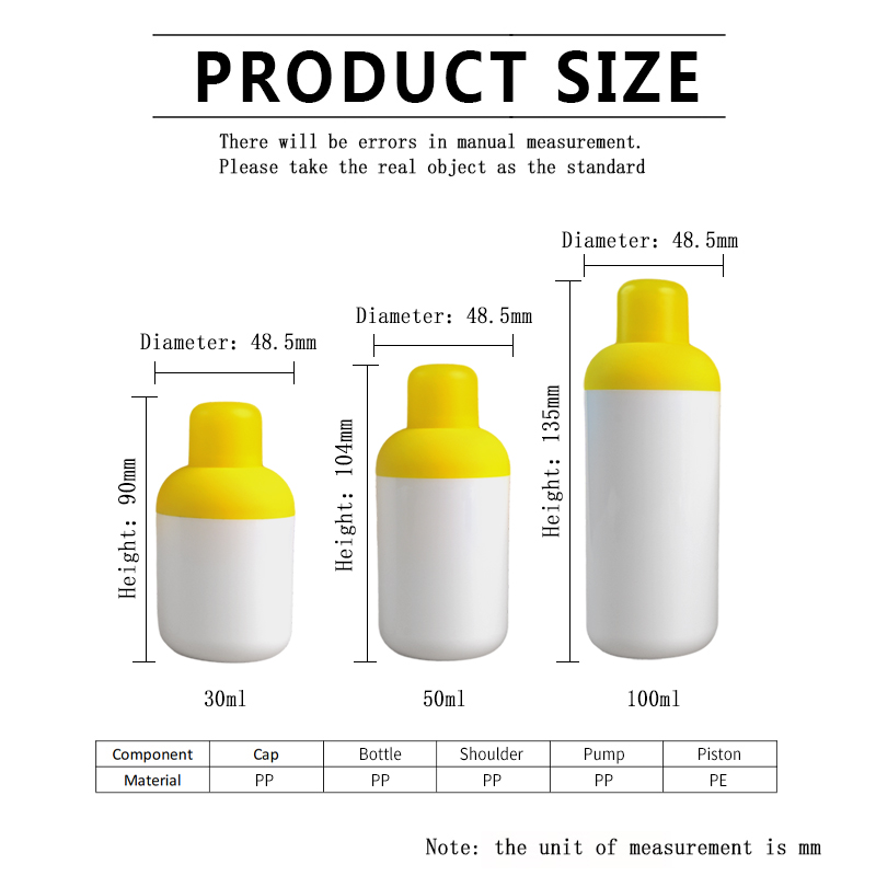 Şûşeyên me yên kozmetîkî yên bêhewa yên xweşik, şiklê wan silindirî ye, quncikên wan girover in, xetên nerm in, mil û qapax qelew û girover in, du şêwazên qapaxan hene ku hûn dikarin ji wan hilbijêrin, ku dihêle hûn di navbera sadehî û xweşikbûnê de biguherin. Ew dikare kapasîteya 30ml, 50ml, 100ml piştgirî bike. Sêwirana wê ya xuyangê xweşik, bi girêdan û balkêşiya xurt, tijî wateya zarokane ya şiklê bêhempa, ji bo hilberên losiyon û kremê yên celebê dayik û pitikan pir guncan e.