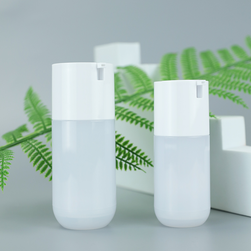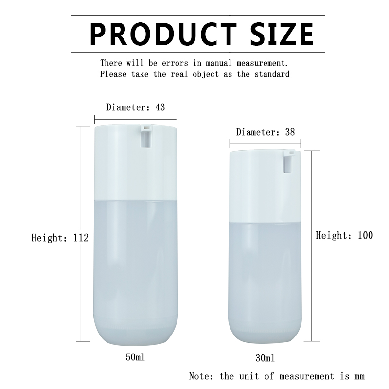 የዚህ 1oz እና 1.7oz አየር የሌለው ጠርሙስ ዋና ዋና ክፍሎች ከPETG ቁሳቁስ የተሠሩ ሲሆኑ ከፍተኛ ግልጽነት እና ጠንካራ የዝገት መቋቋም ባህሪያት አሉት። ለአብዛኛዎቹ የመዋቢያ ምርቶች ተስማሚ ሲሆን የተለያዩ የድህረ-ምርት ሂደቶችን ይደግፋል። ከPETG ቁሳቁስ በተሠሩ ጠርሙሶች ላይ የህትመት ግልጽነት የበለጠ የተሻለ ነው።