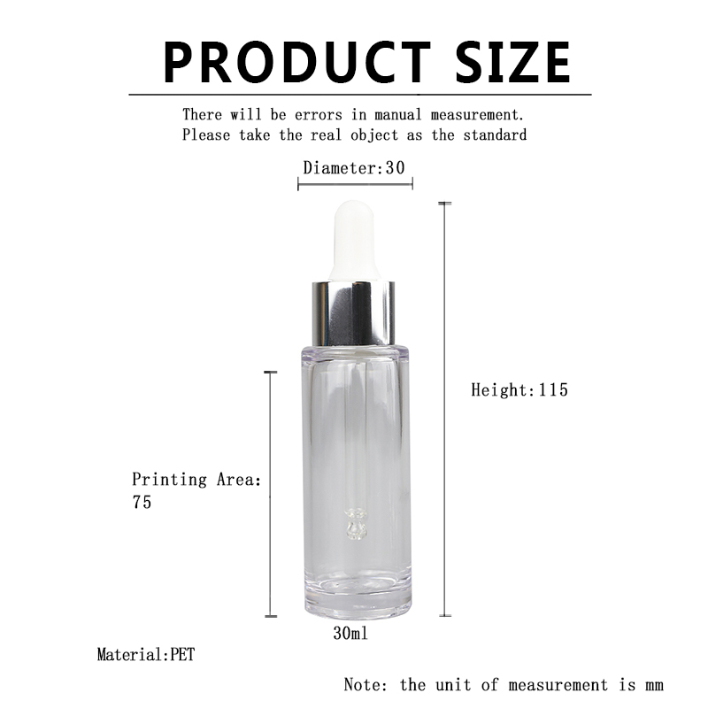 Denne flaskes åbning er 20 mm, og vi har 3 lukninger, der kan matches: pipette, lotionpumpe og spraypumpe. Dette gør det muligt for de pakkede produkter at dække en bred vifte af kosmetiske kategorier.