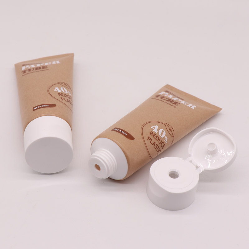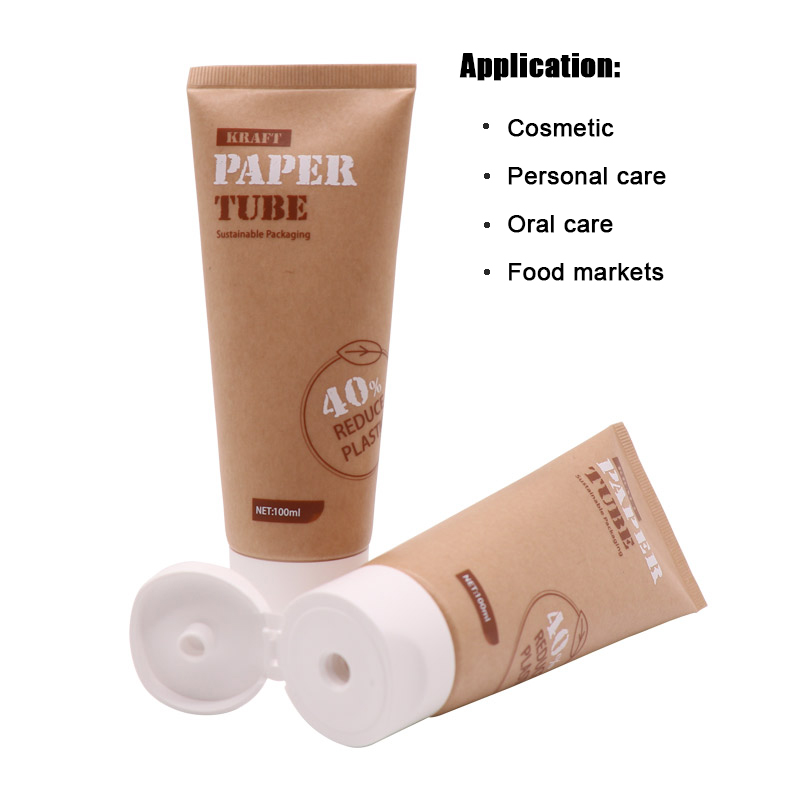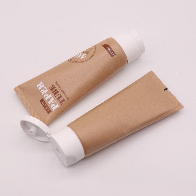 The custom cardboard squeeze cosmetic tubes packaging are made from 27% recycled Kraft paper and waterproof plastic layer to reduce carbon emissions by about 40%. The wooden color (natural) kraft has laminate structure and FSC certified.