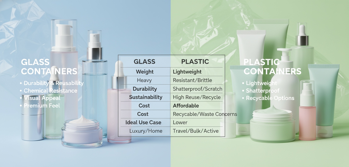 Greitas žvilgsnis, kaipstiklasirplastikasgali būti laikomi ekologiškais kosmetikos pakuočių sprendimais – pagalvokite apie patvarumą, svorį ir tvarumą.