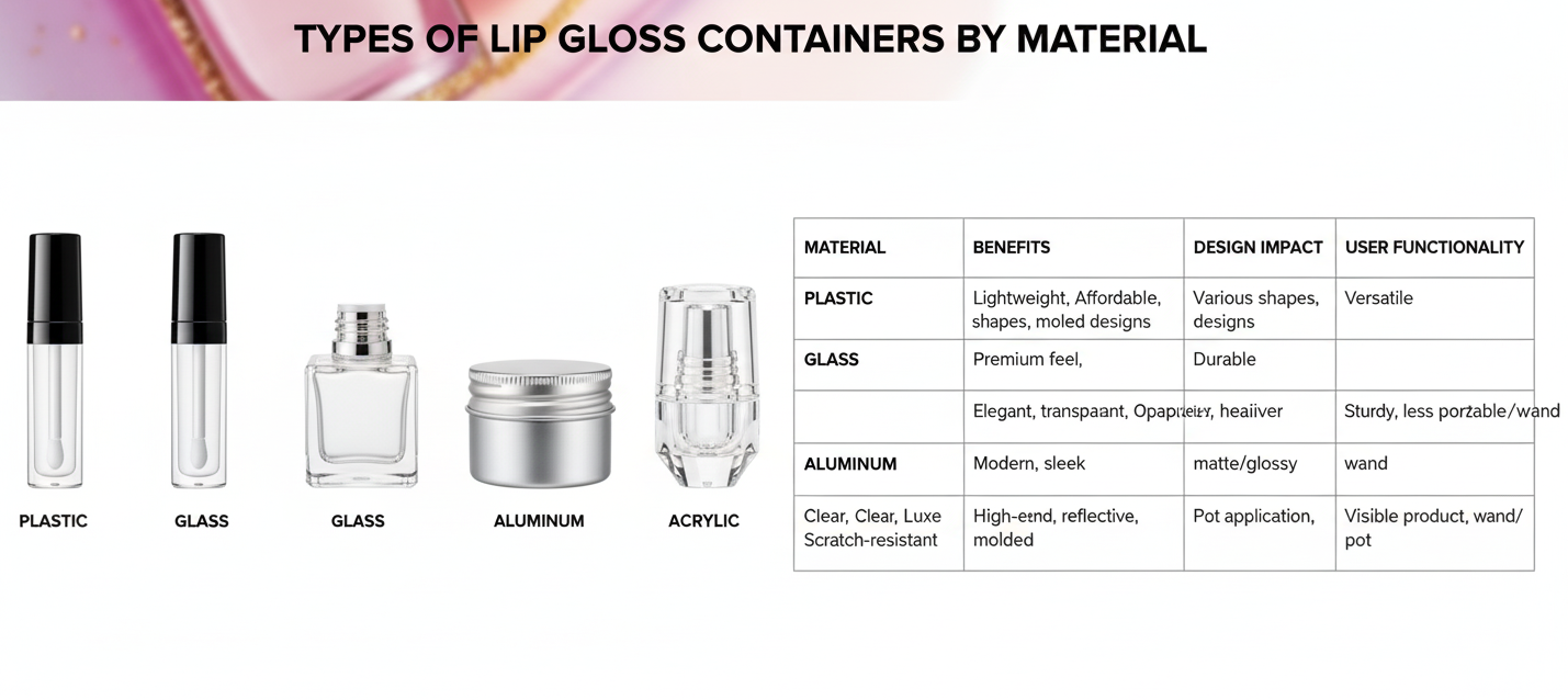 Lūpų blizgesio konteinerių tipai pagal medžiagą