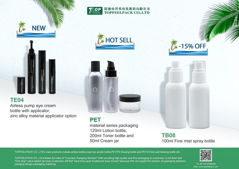 2. PET medžiagų serijos pakuotė 120 ml losjono buteliukas, 200 ml tonerio buteliukas ir 50 ml kremo indelis.