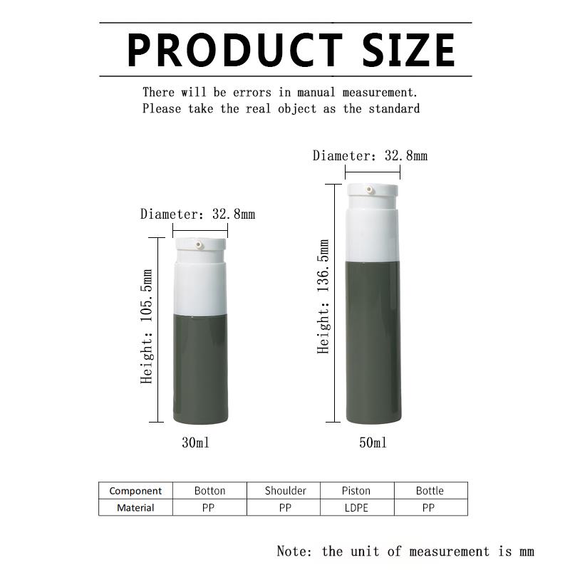 ※Misy amin'ny habe roa: 30ml sy 50ml. Boribory sy mahitsy ny endriny, tsotra ary misy lamina. Vita amin'ny plastika PP avokoa izy rehetra.