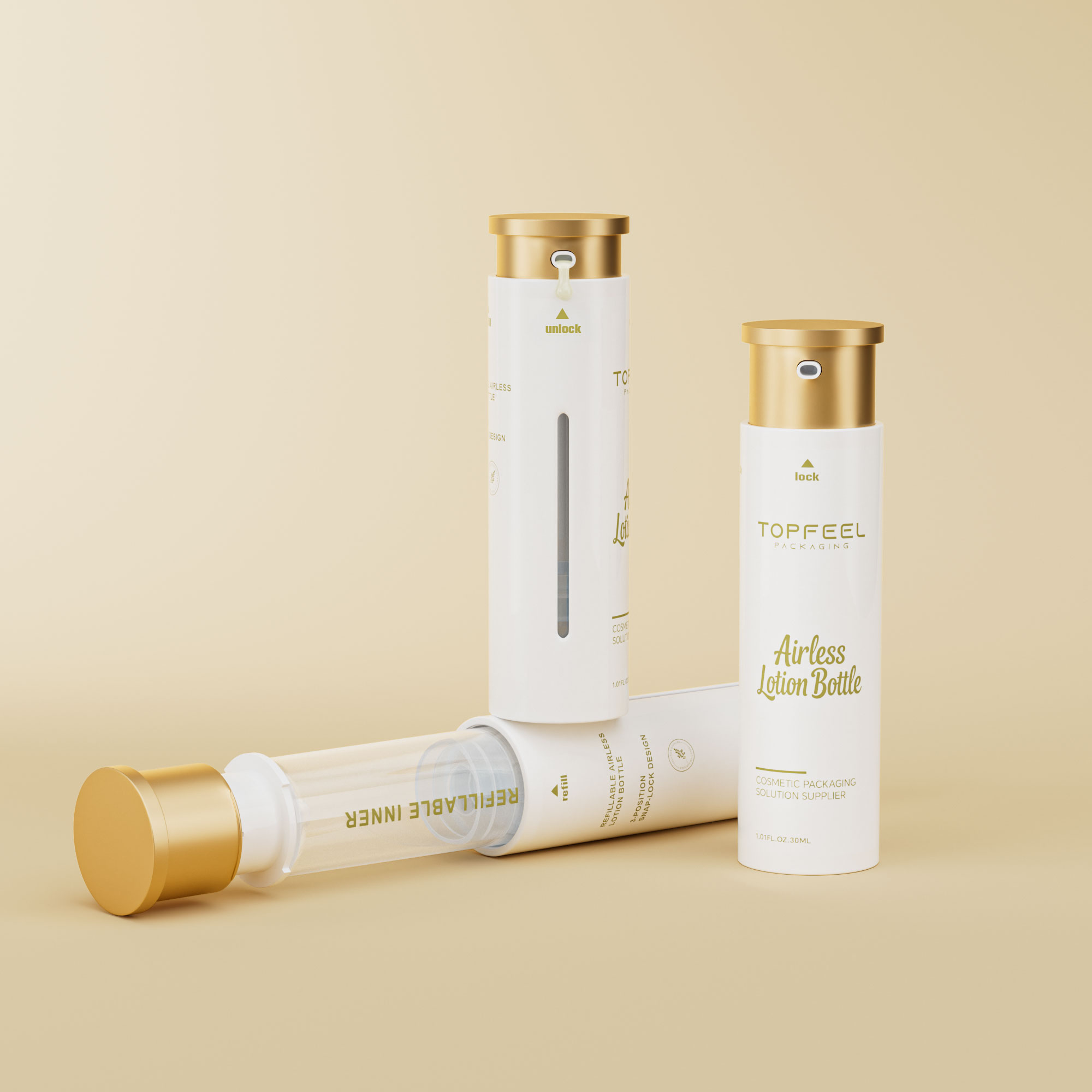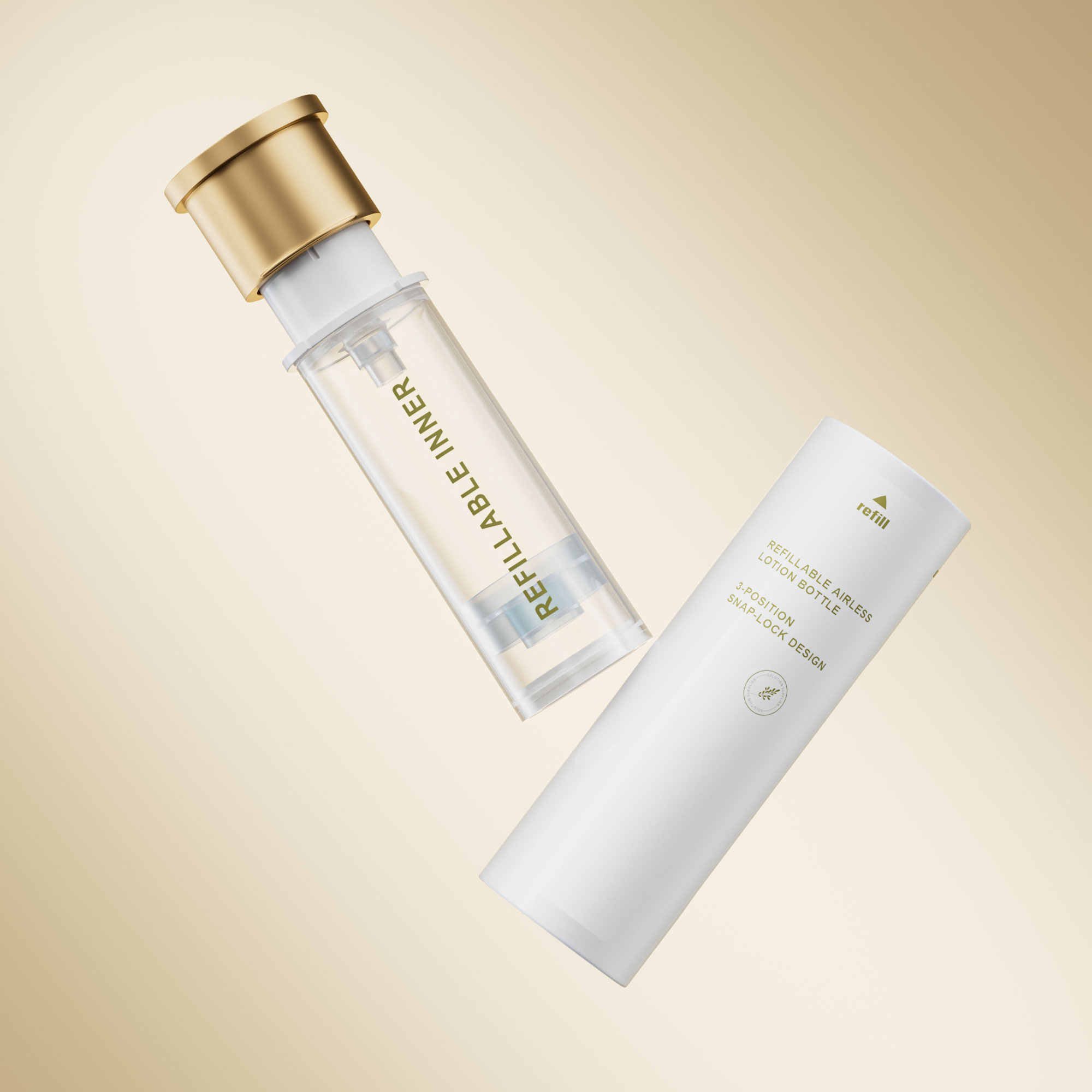 It is a refillable airless lotion bottle with a smart 3-Position Snap-Lock Design, created to give users better control, higher safety, and easy refill experience.